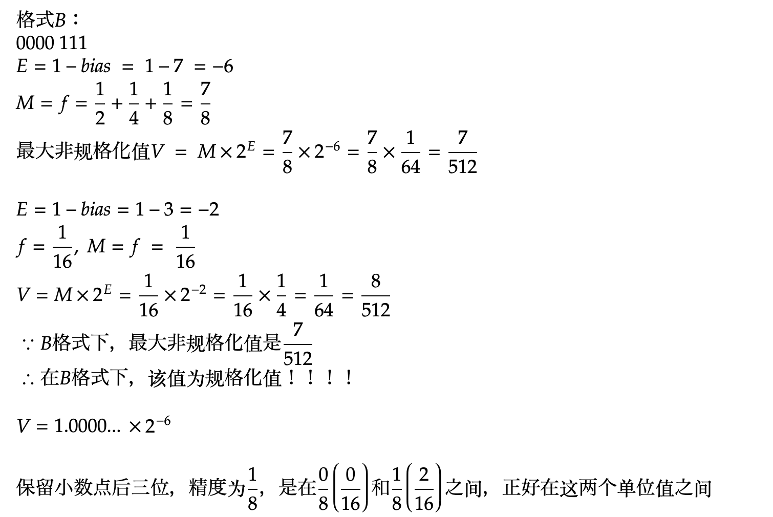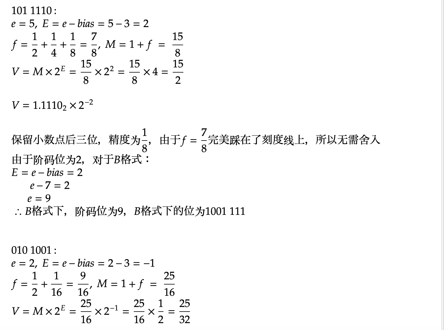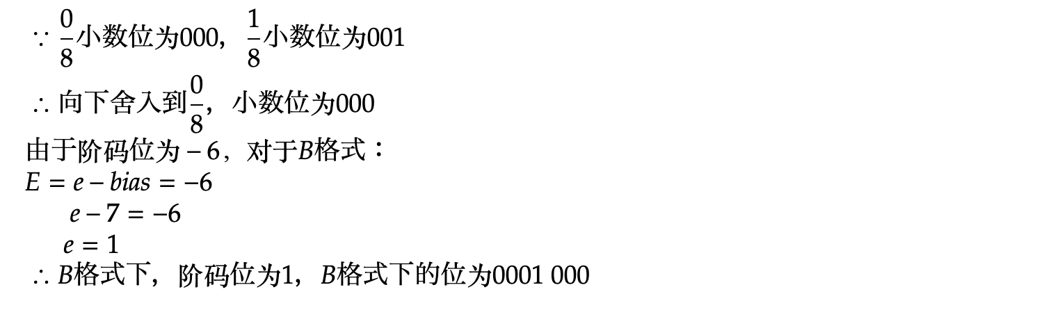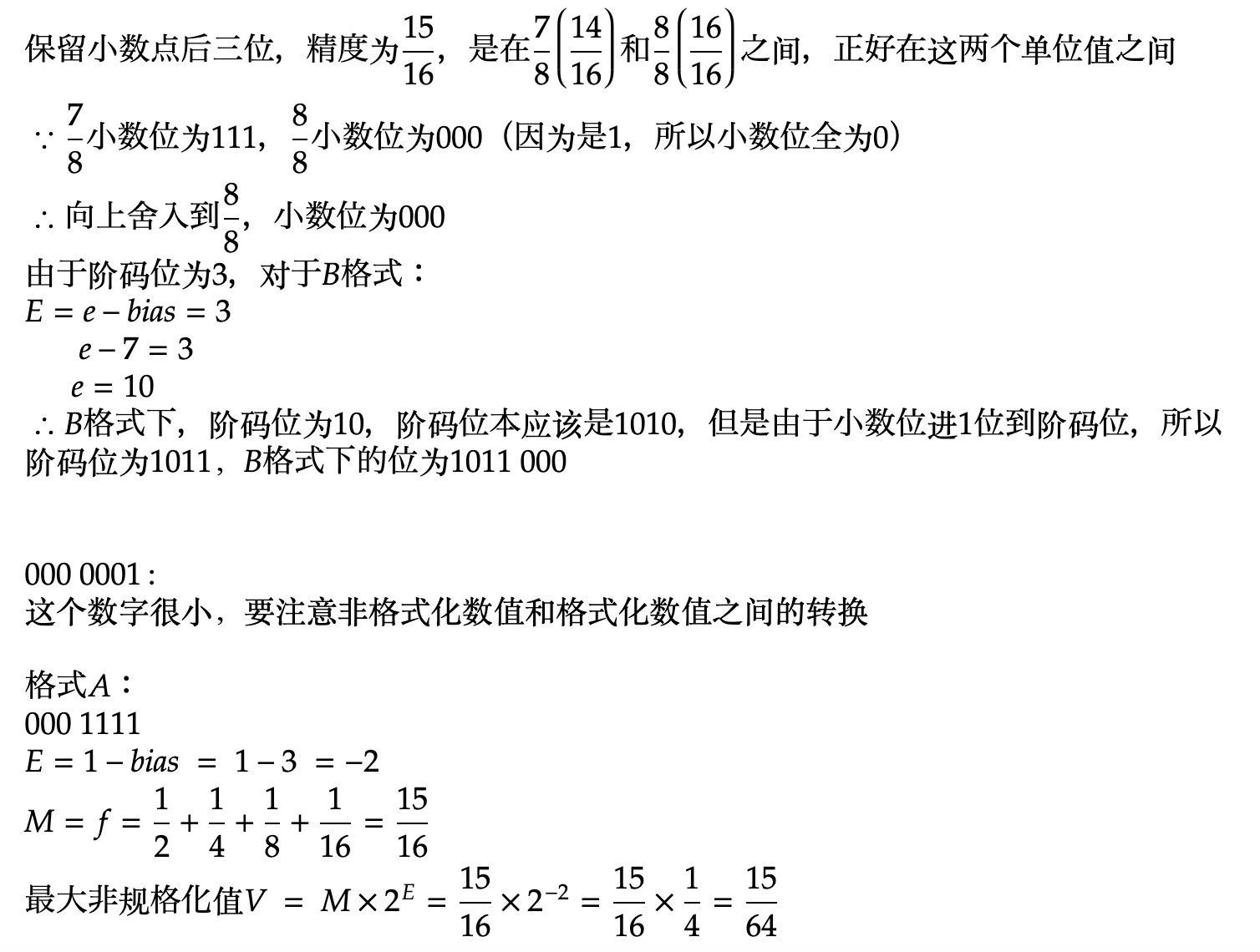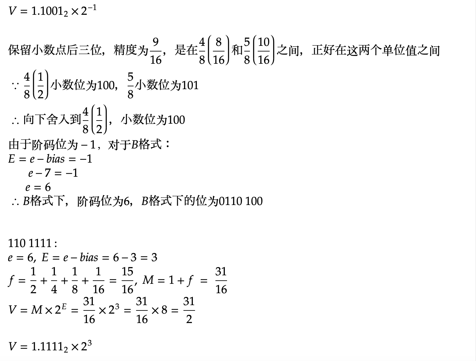 下面给出了一些格式A表示的位模式,你的任务是将它们转换成格式B中最接近的值。如果需要,请使用舍入到偶数的舍入原则。另外,给出由格式A和格式B表示的位模式对应的数字的值。给出整数(例如17)或者小数(例如17/64)。