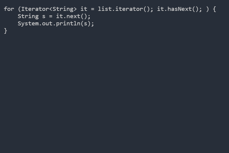 for (Iterator<String> it = list.iterator(); it.hasNext(); ) {String s = it.next();System.out.println(s);