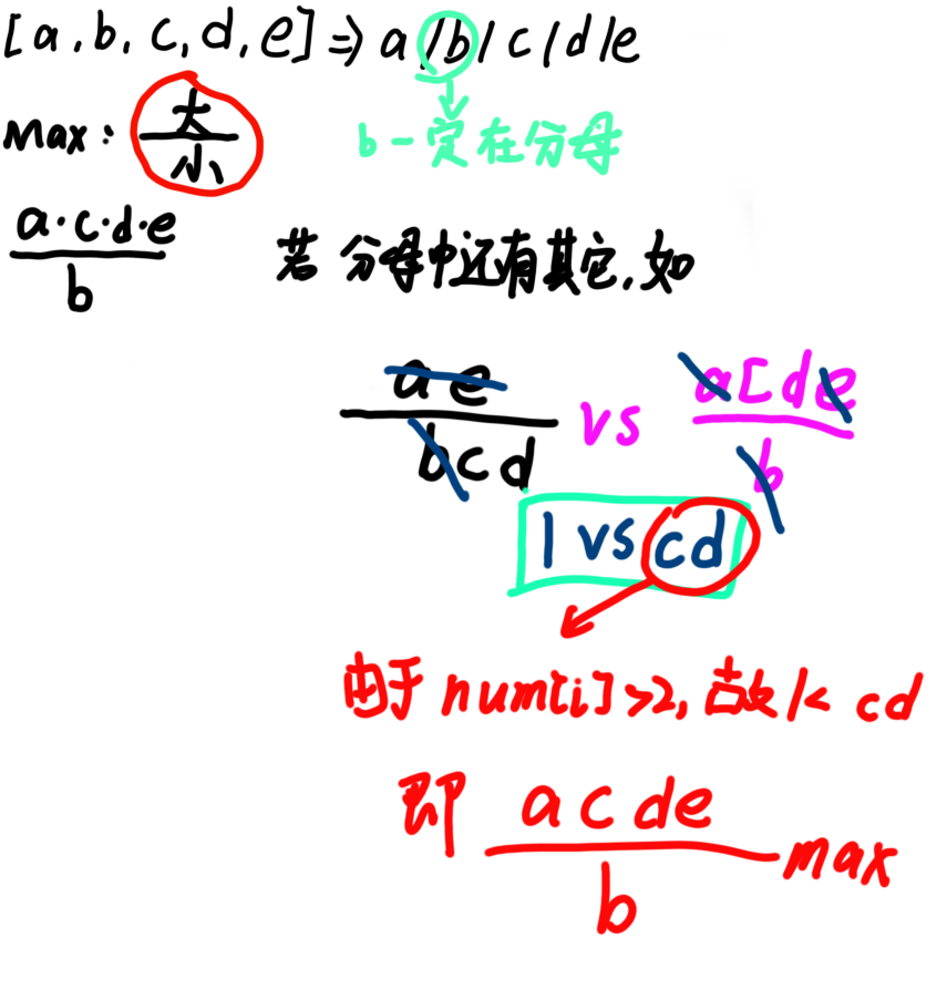 输入: nums = [2,3,4] 输出: "2/(3/4)" 解释: (2/(3/4)) = 8/3 = 2.667 可以看出,在尝试了所有的可能性之后,我们无法得到一个结果大于 2.667 的表达式。说明: