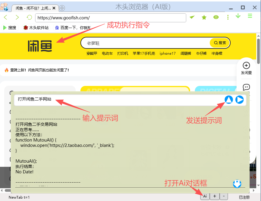 6、最后我们测试一下效果吧,打开浏览器Ai控制窗口,输入提示词“打开闲鱼二手网站”,浏览器调用本地Ai大模型接口,获取完成操作需要的代码,并执行代码完成操作。