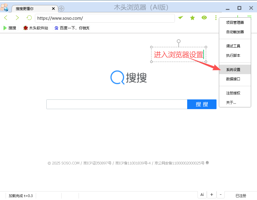4、Ollama云端大模型部署完毕,其本地API已默认开启,浏览器如何调用API呢?打开木头AI浏览器,进入系统设置。