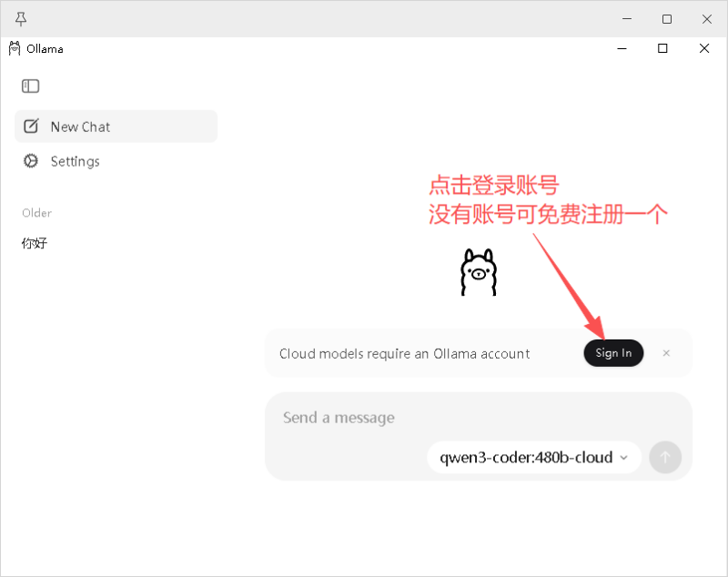 3、选择云端大模型后,Ollama要求我们登录账号,如果你还没有账号,点击注册一个新账号就可以了,这一切都是免费的哦。