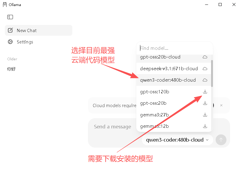 2、运行Ollama主程序,打开图形界面,有多种大模型可以选择,注意:模型列表右侧有下载图标的,是把模型下载到本地部署,根据显卡显存容量选择适当的大模型。对于没有高端显卡的友友们,直接选择云端大模型体验满血版,由于我们主要面对浏览器自动化处理,推荐选择coder版大模型效果更好。这里选择阿里的qwen3-coder:480b-cloud