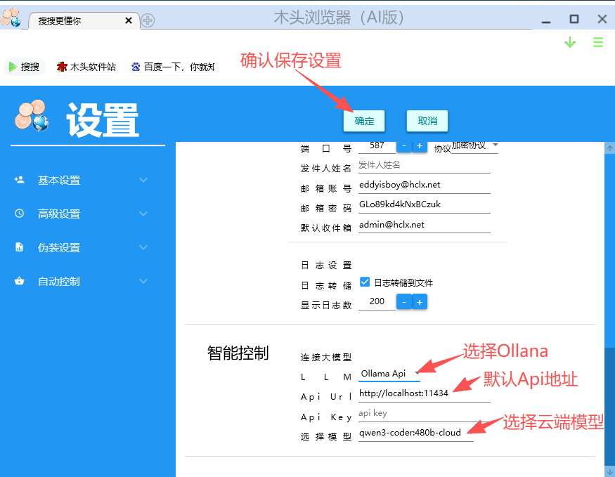 5、在智能控制设置中,选择Ollama Api,调用本地http://localhost:11434端口,浏览器自动加载当前可用的大模型列表,同样选择云端大模型qwen3-coder:480b-cloud.