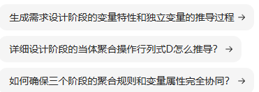Q231、您说的太复杂了,简单说是 您前面“段表述完整性验证” 中的 后三列“属性匹配(用户要求)”、“内容补充重点”和“细节呈现形式”刚好是 需求设计、概要设计和详细设计,表述了 三种“变量” 的 "量”由少变多。 ( 数量(实际中的实体数量)变化)
