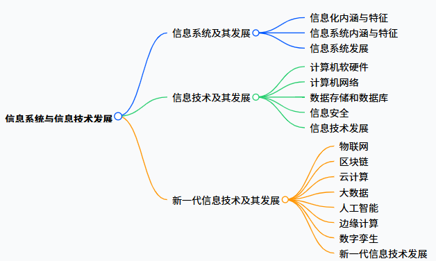 本章节内容偏重于概念知识,其重要知识点有:信息化内涵与特征、信息系统内涵与特征、信息系统发展、计算机软硬件、计算机网络、数据存储和数据库、信息安全、信息技术发展、物联网区块链、云计算、大数据、人工智能、边缘计算、数字孪生、新一代信息技术发展。
