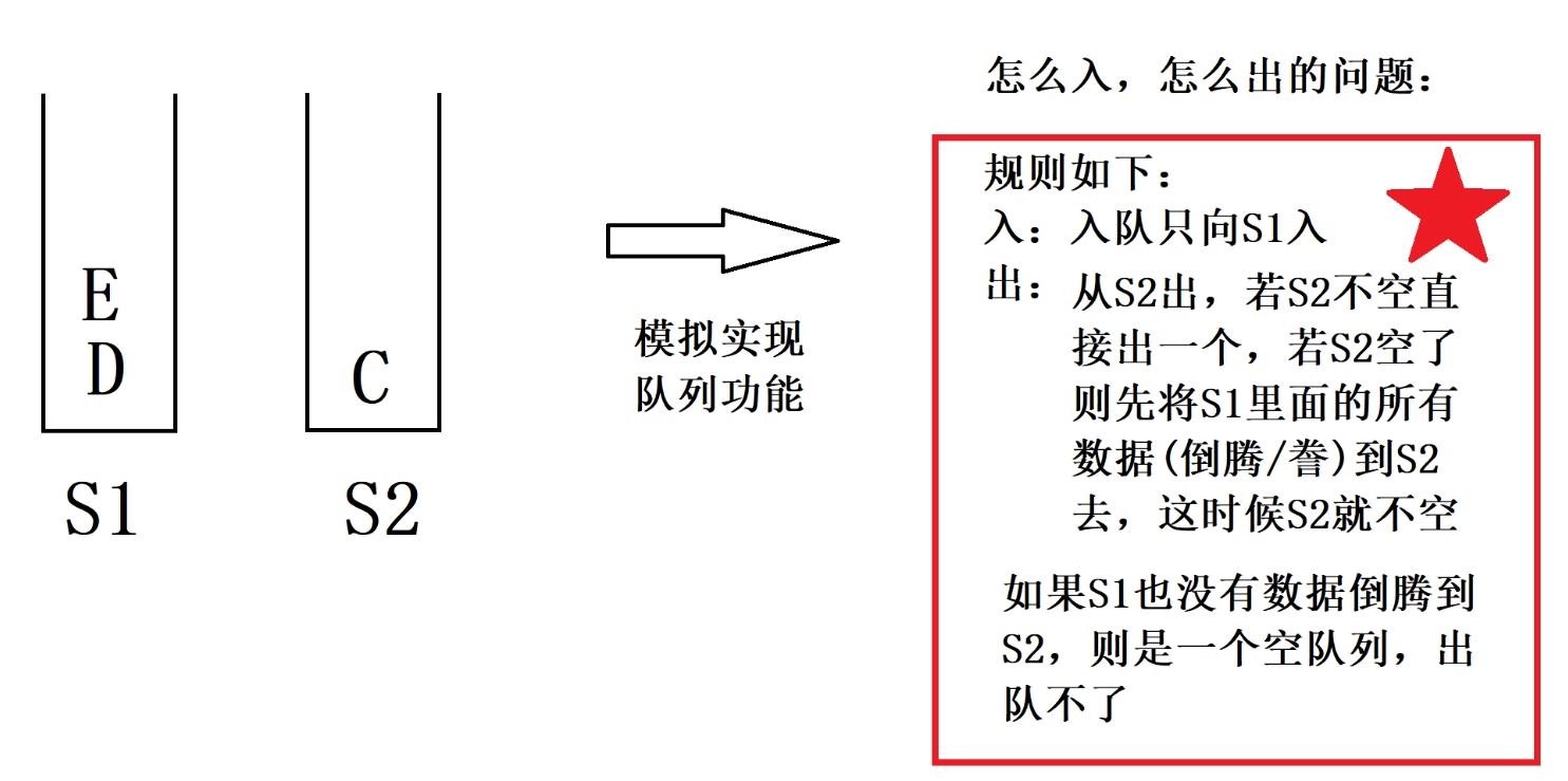 {if (tstq->S1.empty() && tstq->S2.empty())//先保证有元素return false;if (tstq->S2.empty())//看看栈2空不空{while (!tstq->S1.empty())//当栈1空了就停 直到将栈1数据全部导完{//将S1中的数据放到S2中 下面是只放一个数据的操作ELEMTYPE tmp = tstq->S1.top();tstq->S1.pop();tstq->S2.push(tmp);}}printf("%c\n", tstq->S2.top());tstq->S2.pop();return true;