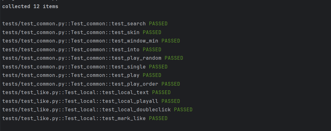 class Test_common:# 获取日志对象logger=Logger.GetLog()# 测试搜索框def test_search(self,QQmusic_App):# 定位YAML中元素的位置edit_ele=read_yaml("search")# 定位搜索框的位置edit=QQmusic_App.win.child_window(auto_id=edit_ele["auto_id"],control_type=edit_ele["control_type"])# 点击一下edit.click_input()# 输入内容edit.type_keys("邓紫棋")#全选并且删除edit.type_keys("^a{BACKSPACE}")# 换皮肤模块def test_skin(self,QQmusic_App):# 定位YAML中元素的位置skin_ele = read_yaml("skin")# 定位换皮肤按钮的位置skin=QQmusic_App.win.child_window(auto_id=skin_ele["auto_id"],control_type=skin_ele["control_type"])# 点击按钮,唤起弹窗skin.click_input()# 验证弹窗是否出现warning=QQmusic_App.win.child_window(title="温馨提示",control_type="Window")warning.wait("visible")# 获取文本text=warning.child_window(control_type="Text").window_text()# 验证文本是否正确assert text=="换肤功能小哥哥正在紧急支持中..."#关闭温馨提示窗口warning.close()# 验证是否关闭warning.wait_not("visible")# 窗口最小化def test_window_min(self, QQmusic_App):# 定位YAML中元素的位置minimize_ele = read_yaml("minimize")# 定位最小化按钮的位置minimize = QQmusic_App.win.child_window(auto_id=minimize_ele["auto_id"], control_type=minimize_ele["control_type"])# 点击按钮,窗口最小化minimize.click_input()# 检查是否最小化assert QQmusic_App.win.is_minimized()# 将窗口还原QQmusic_App.win.restore()# 导入所有音乐def test_into(self,QQmusic_App):# 定位YAML中元素的位置into_ele = read_yaml("导入音乐")# 定位导入按钮的位置minimize = QQmusic_App.win.child_window(auto_id=into_ele["auto_id"], control_type=into_ele["control_type"])# 点击导入按钮,跳出添加窗口minimize.click_input()# 定位添加下载本地音乐窗口download=QQmusic_App.win.child_window(title="添加本地下载音乐",control_type="Window")download.wait("visible")# 定位存放音乐列表的区域list=download.child_window(title="项目视图",control_type="List")# 将输入栏的焦点,转移到项目视图中list.set_focus()# 全选音乐,并且确认list.type_keys("^a{ENTER}")# 查看是否退出该添加下载本地音乐窗口download.wait_not("visible")# 播放音乐(验证随机播放)def test_play_random(self,QQmusic_App):# 定位YAML中元素的位置download_ele = read_yaml("本地下载")# 定位本地下载的位置download = QQmusic_App.win.child_window(auto_id=download_ele["auto_id"],control_type=download_ele["control_type"])# 点击本地下载download.click_input()# 定位并且点击播放全部play_all_ele = read_yaml("播放全部")play_all = QQmusic_App.win.child_window(auto_id=play_all_ele["auto_id"],control_type=play_all_ele["control_type"])# 循环三次,如果三次都失败,则证明随机播放失败for i in range(1,4):# 点击全部播放play_all.click_input()# 点击下一首next_ele = read_yaml("下一首")next = QQmusic_App.win.child_window(auto_id=next_ele["auto_id"], control_type=next_ele["control_type"])next.click_input()time.sleep(2)# 歌曲名字name_ele = read_yaml("歌曲名字")name = QQmusic_App.win.child_window(auto_id=name_ele["auto_id"], control_type=name_ele["control_type"])name_str = name.window_text()if name_str!="时间你慢些走":self.logger.info(f"第{i}次,播放正确")returnelse:self.logger.error(f"第{i}次,播放错误")self.logger.error("随机播放错误")return# 单曲循环def test_single(self,QQmusic_App):# 定位YAML中元素的位置download_ele = read_yaml("本地下载")# 定位本地下载的位置download = QQmusic_App.win.child_window(auto_id=download_ele["auto_id"],control_type=download_ele["control_type"])# 点击本地下载download.click_input()# 定位并且点击播放全部play_all_ele = read_yaml("播放全部")play_all = QQmusic_App.win.child_window(auto_id=play_all_ele["auto_id"],control_type=play_all_ele["control_type"])# 将随机播放,切换到单曲循环switch_ele=read_yaml("切换")switch = QQmusic_App.win.child_window(auto_id=switch_ele["auto_id"],control_type=switch_ele["control_type"])play_all.click_input()# 验证三次播放单曲循环for i in range(1,4):# 点击播放全部play_all.click_input()# 定位播放总进度条progress_ele = read_yaml("播放总进度条")progress = QQmusic_App.win.child_window(auto_id=switch_ele["auto_id"], control_type=switch_ele["control_type"])# 获取进度条大尺寸rec = progress.rectangle()x = rec.right - 3y = math.floor((rec.top + rec.bottom)/2)# 鼠标点击该进度条大尾部mouse.click(coords=(x,y))# 等待切换下一首time.sleep(2)# 歌曲名字name_ele = read_yaml("歌曲名字")name = QQmusic_App.win.child_window(auto_id=name_ele["auto_id"], control_type=name_ele["control_type"])name_str = name.window_text()if name_str=="2002年的第一场雪":self.logger.info(f"第{i}次单曲循环正确")returnelse:self.logger.error(f"第{i}次单曲循环错误")# 单曲循环失败self.logger.error("单曲循环失败")return# 播放音乐(顺序播放)(验证暂停,下一首,上一首是否正确)def test_play(self,QQmusic_App):# 定位YAML中元素的位置download_ele = read_yaml("本地下载")# 定位本地下载的位置download = QQmusic_App.win.child_window(auto_id=download_ele["auto_id"], control_type=download_ele["control_type"])# 点击本地下载download.click_input()# 将单曲播放,切换到顺序switch_ele = read_yaml("切换")switch = QQmusic_App.win.child_window(auto_id=switch_ele["auto_id"], control_type=switch_ele["control_type"])switch.click_input()# 定位并且点击播放全部play_all_ele=read_yaml("播放全部")play_all = QQmusic_App.win.child_window(auto_id=play_all_ele["auto_id"],control_type=play_all_ele["control_type"])play_all.click_input()# 点击暂停stop_ele=read_yaml("暂停")stop=QQmusic_App.win.child_window(auto_id=stop_ele["auto_id"],control_type=stop_ele["control_type"])stop.click_input()time.sleep(2)# 点击开始stop.click_input()# 点击下一