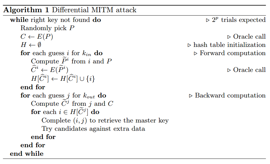 ,对外两端用MITM的方式并行枚举部分子密钥并在中间做匹配。可以令状态位长度为n,主密钥长度为k,上半部分需要猜位