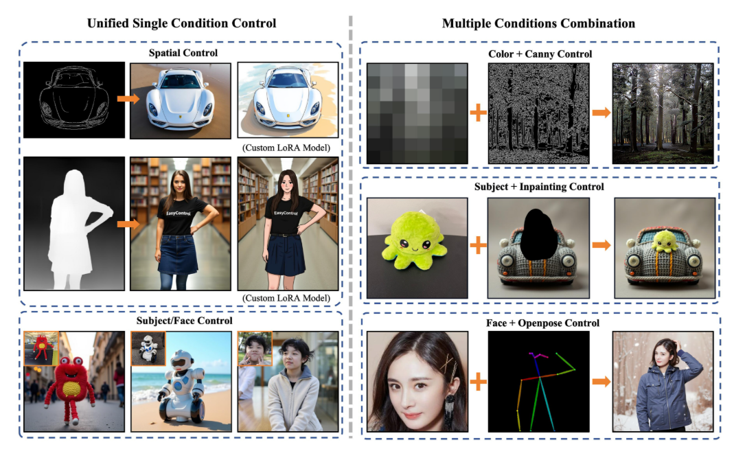 早期的unet架构的方法通过冻结预训练参数并引入额外的适配器或encoder结构实现预训练模型的灵活扩展,DiT架构标志该领域往基于token的方法过渡,这些方法通过vae编码器将条件图像转换为token序列,将其与噪声潜在表示连接,并对模型进行微调,以实现条件引导生成。DiT方法的问题:1.计算瓶颈问题,当引入额外的图像标记时,由于自注意力机制,其时间复杂度相对于输入长度呈平方级增长;2.存在多条件协同控制挑战,现有方法难以在但条件训练范式下实现多条件指导下的稳定协调,潜在空间中不同条件信号的表征冲突导致生成质量下降,特别是在零样本多条件组合场景中,模型缺乏有效的跨条件交互机制;3.模型适应性存在局限性。尽管当前的参数高效微调方法能够保持骨干网络参数冻结,但微调模块与社区中的定制模型之间存在参数冲突,这种设计缺陷导致在风格迁移过程中出现特征退化,限制了模块的即插即用特性。