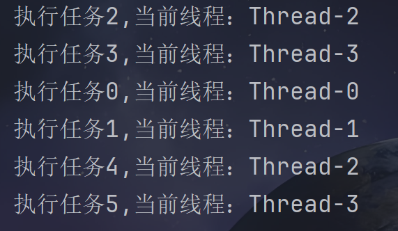 public class ThreadDemo17 {public static void main(String[] args) throws InterruptedException {MyThreadPoolExecutor myThreadPoolExecutor = new MyThreadPoolExecutor(4);for (int i = 0; i < 1000; i++) {int n = i;myThreadPoolExecutor.submit(new Runnable() {@Overridepublic void run() {System.out.println("执行任务" + n + ",当前线程:" + Thread.currentThread().getName());}});}}