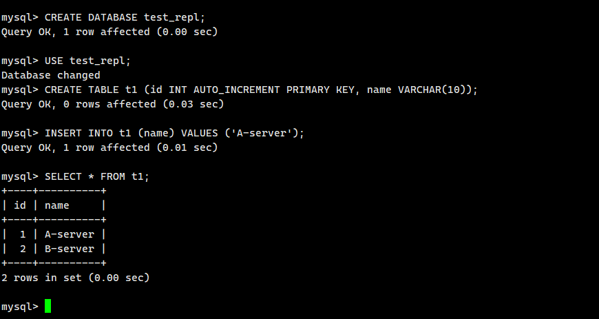 在服务器 A 上创建测试数据库和表: