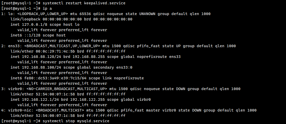 在 节点 1(主节点) 手动停止 MySQL 服务,触发 Keepalived 健康检查: