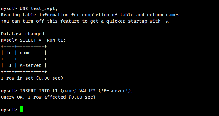 在服务器 A 上执行以下 SQL,设置其复制源为服务器 B: