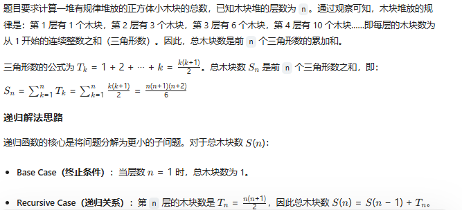 int ans(int n) {if (n == 1) { // 基准情况:1层只有1个木块return 1;} else {// 递归关系:n层总数 = (n-1)层总数 + 第n层的木块数(三角形数T_n)return ans(n - 1) + n * (n + 1) / 2;}