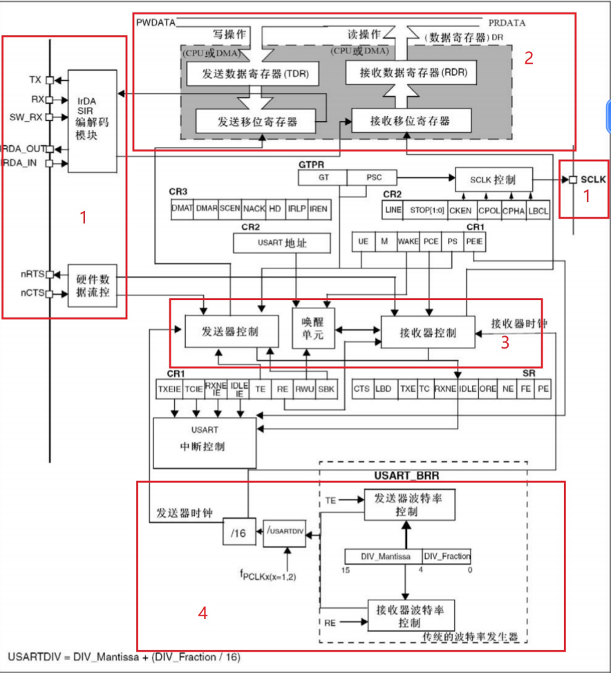 首先,根据之前提到的时钟树的相关内容,以及图上的信息,我们在编写代码时得注意,只有USART1是挂载在APB2上面的,另外两个2和3挂载在APB1上。