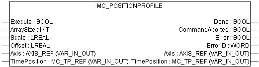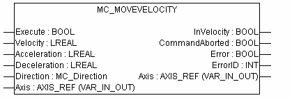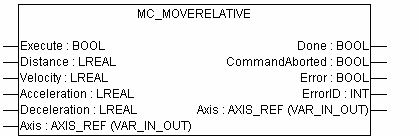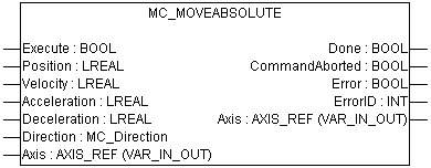 此功能块属于SM_PLCopen.lib库,用于根据预设的速度、减速度和加速度值将轴移动到绝对位置。对于直线轴,方向值将被忽略;对于旋转轴,该值将决定旋转方向。