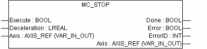 此功能块隶属于 SM_PLCopen.lib库,用于将轴减速至零速。只要输入"Execute"为TRUE且轴尚未完全停止,该过程将不可中断且轴控制权将被锁定。