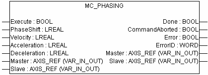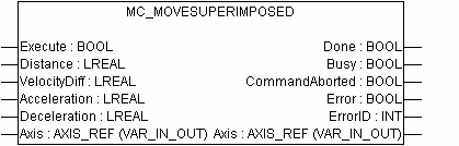 使用该模块(由SM_PLCopen.lib库提供),可实现主轴与从轴之间的恒定距离保持。在此模式下,主从轴具有完全相同的速度和加速度。实现方式为:从轴通过加速或减速达到与主轴相同的速度,当达到同步状态后,将在主轴上执行附加运动(类似于MC_MoveSuperImposed功能),从而实现所需的相位偏移。