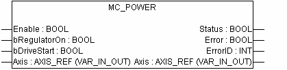 此功能块属于SM_PLCopen.lib库,用于控制驱动器的电源启停开关及制动器状态。若驱动器未通过此方式上电、控制器未解除阻塞或制动器未释放,则无法进行任何运动控制操作。