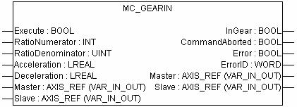 使用该模块(由SM_PLCopen.lib库提供),可将从轴与主轴进行耦合。从轴速度将成为主轴速度的f倍,系数 f 由输入参数RatioNumerator与RatioDenominator的商值决定。