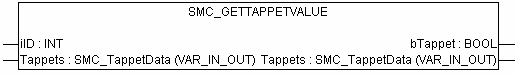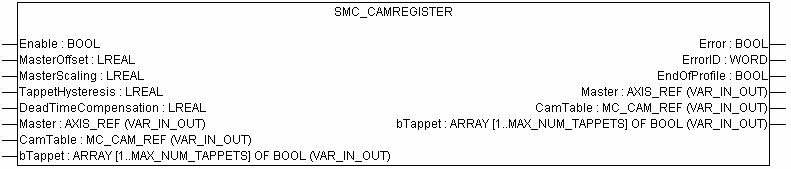 该模块提供一项附加功能:可检测挺杆(tappets)并通过输出Tappets将挺杆信息传递至一个或多个MC_GetTappetValue功能块(参见SMC_GetTappetValue)。需注意,CamIn模块每个周期最多只能注册三个挺杆,而SMC_CAMRegister模块无此限制。