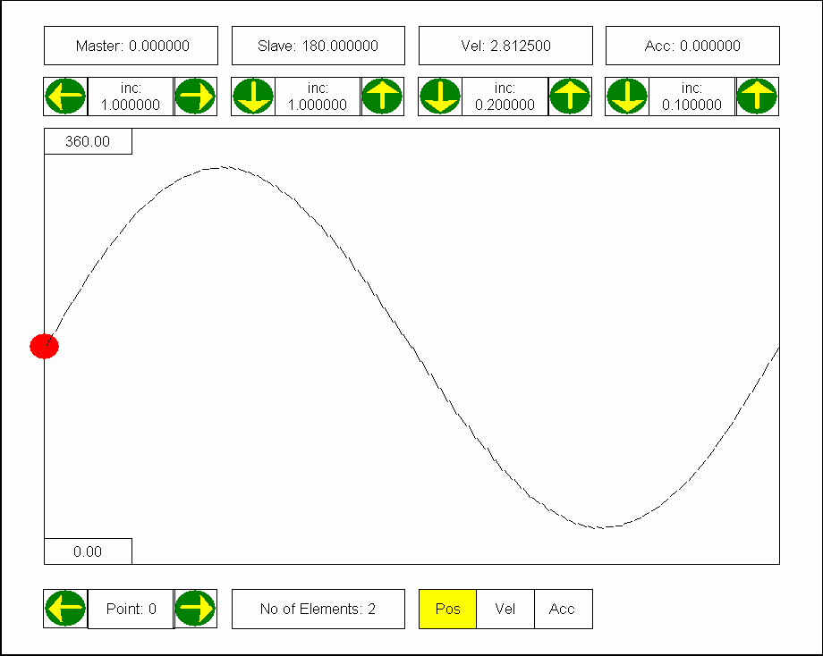 红色圆圈标记的是当前凸轮点。可通过左下角的箭头按钮进行修改。右下角的按钮用于选择显示位置、速度或加速度参数。上方工具栏的箭头按钮可用于按特定增量调整主轴位置、从轴位置、从轴速度及从轴加速度。