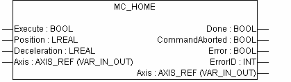 此功能块属于SM_PLCopen.lib库,用于启动驱动器制造商特定的参考点定位运动。该运动仅由驱动器接口发起,当驱动器反馈定位完成时,输出信号'Done'将置为TRUE。