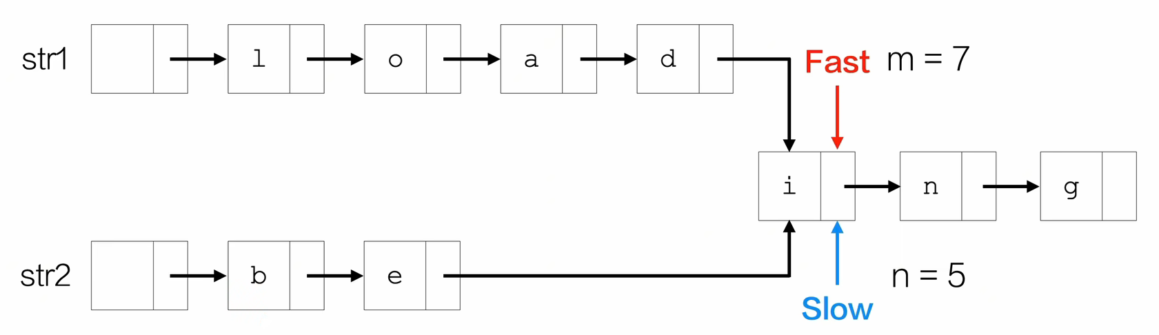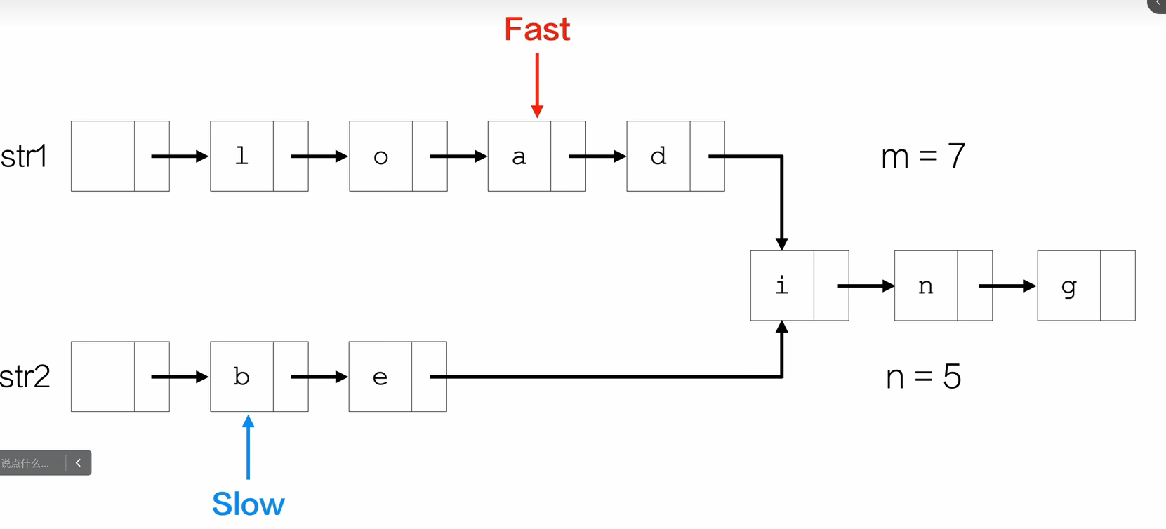 - fast指针指向较长的链表,其先走m-n或者n-m步