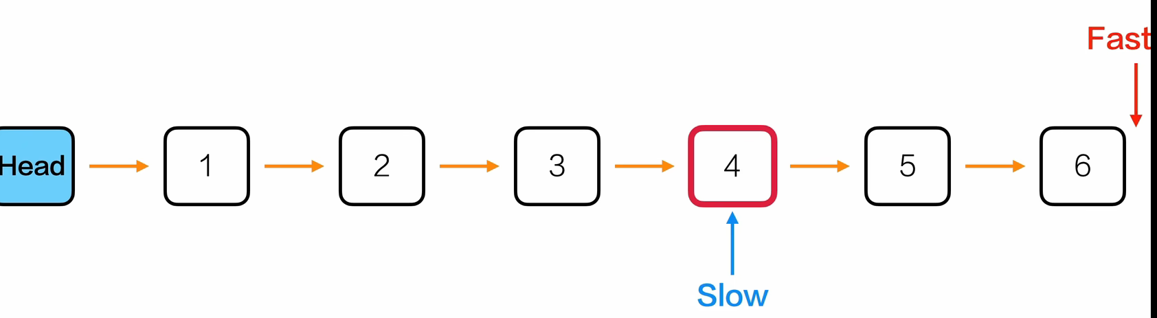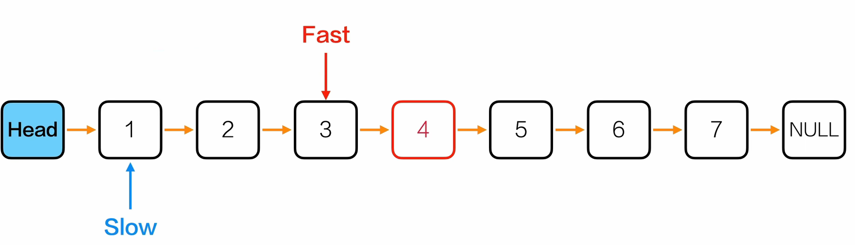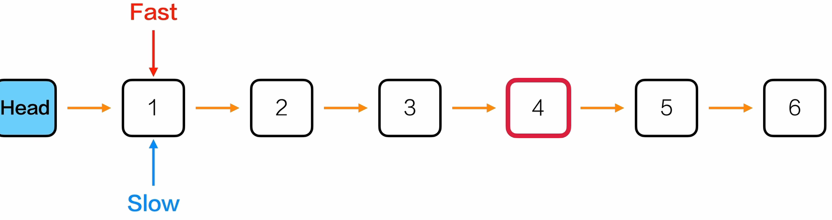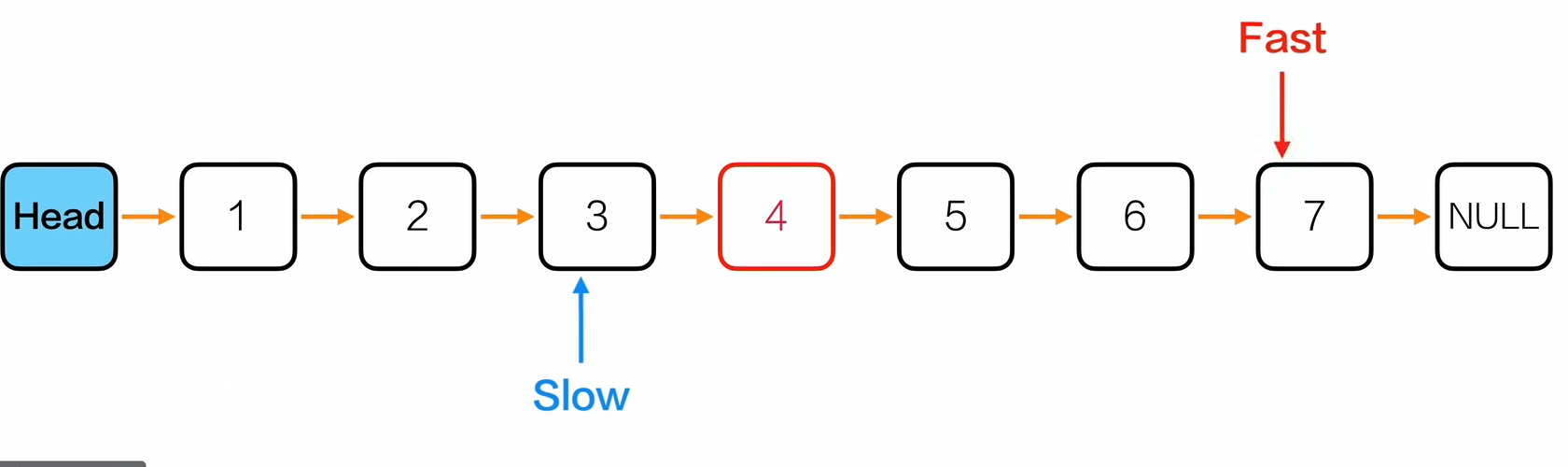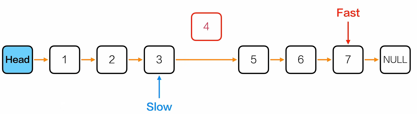 - 发现fast是NULL或者fast的下一个节点是NULL的时候,