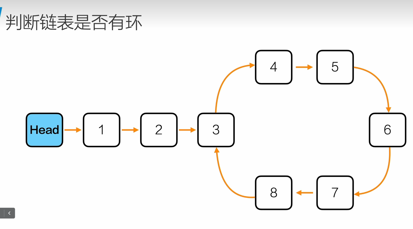 fast和slow先都指向head,fast走两步,slow走一步,如果两个指针可以相遇,说明有环