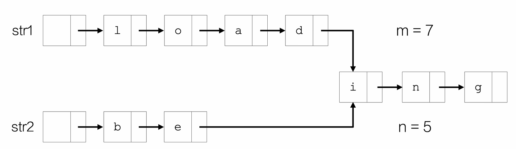Node* find_common_tail(Node *str1, Node *str2) {Node *p1 = str1->next; // 首元结点Node *p2 = str2->next;int m = length(str1);int n = length(str2);// 让较长链表的指针先走 |m-n| 步,对齐剩余长度if (m > n) p1 = advance(p1, m - n);else p2 = advance(p2, n - m);// 同步前进,第一次指针相等处即为共享后缀起点while (p1 && p2 && p1 != p2) {p1 = p1->next;p2 = p2->next;}return (p1 == p2) ? p1 : NULL;