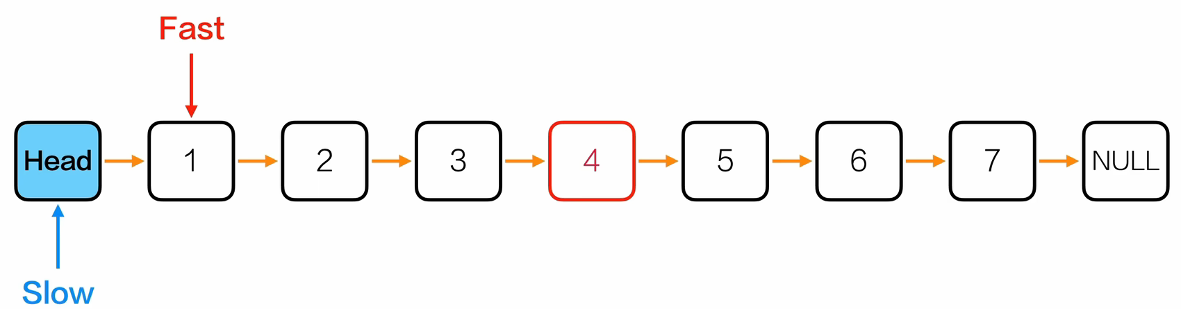 - fast走两步(fast=fast->next->next),slow走一步(slow=slow->next)