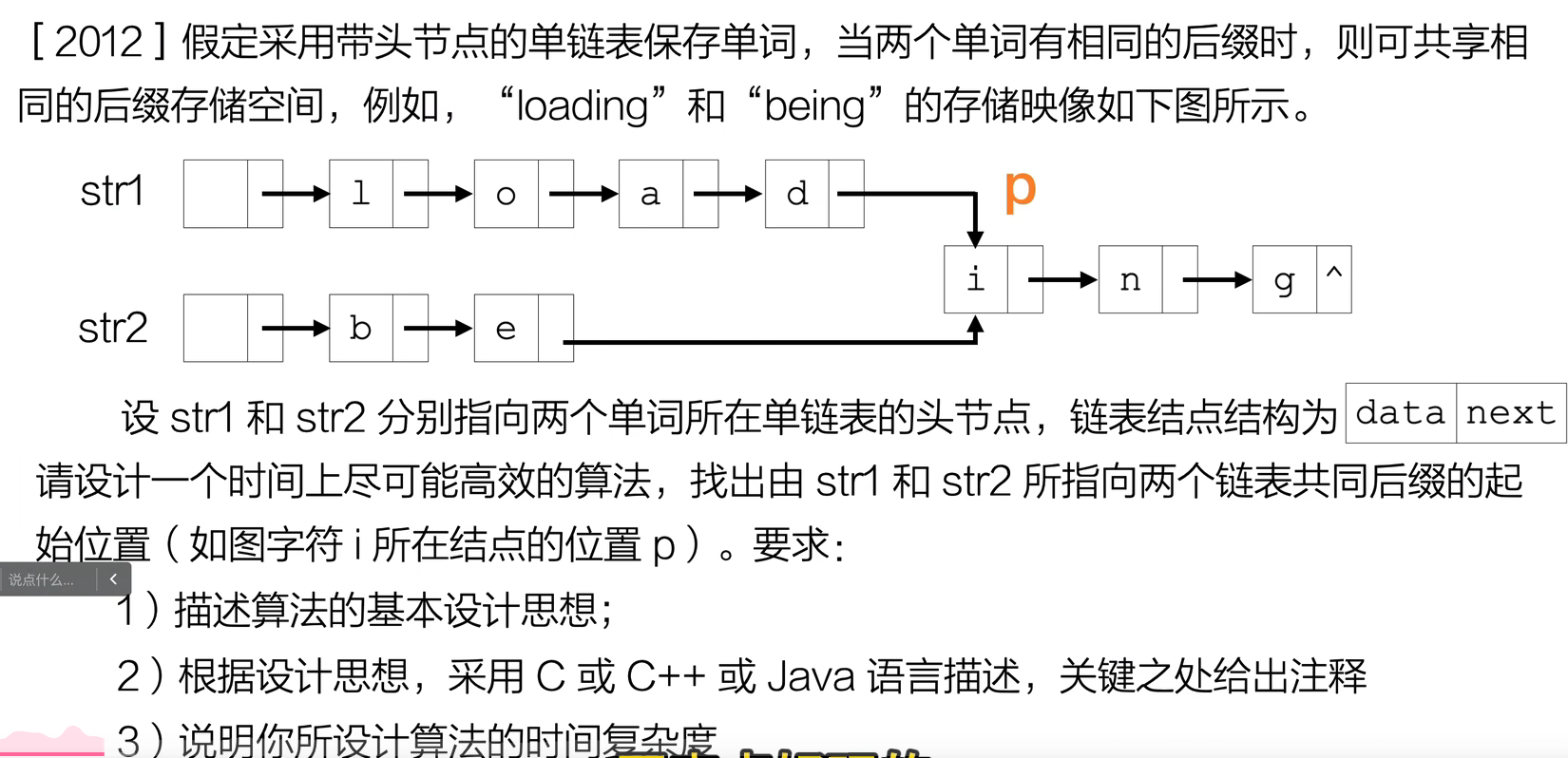 步,使两指针到尾部的剩余长度相同(对齐)。 - 然后两指针同步前进,第一次出现 指针地址相等 的结点即为“共享后缀”的起点;若直到