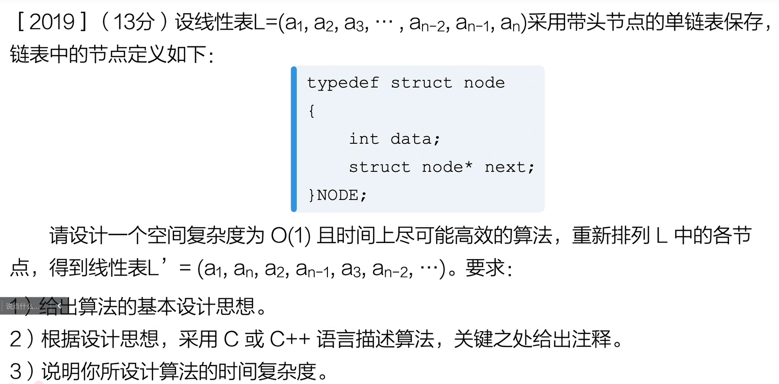 void reorderList(Node *head) {if (head == NULL || head->next == NULL) return;// ① 快慢指针找中点Node *fast = head->next;Node *slow = head;while (fast != NULL && fast->next != NULL) {fast = fast->next->next;slow = slow->next;}// ② 反转后半链表Node *first = NULL;Node *second = slow->next;slow->next = NULL; // 截断前半部分Node *third = NULL;while (second != NULL) {third = second->next;second->next = first;first = second;second = third;}// ③ 交叉合并前后两半Node *p1 = head->next;Node *q1 = first;Node *p2, *q2;while (p1 != NULL && q1 != NULL) {p2 = p1->next;q2 = q1->next;p1->next = q1;q1->next = p2;p1 = p2;q1 = q2;}