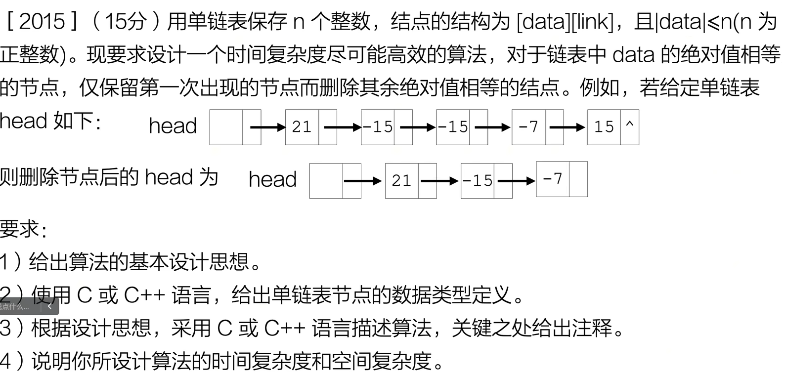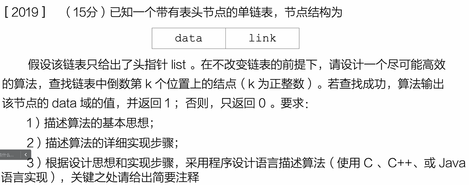 int findNodeFS(Node *L, int k) {Node *fast = L->next; // 首元结点Node *slow = L->next;int i;// fast先走k步for (i = 0; i < k; i++) {if (fast == NULL) {return 0; // 链表长度小于k}fast = fast->next;}// fast和slow同时走,直到fast到达末尾while (fast != NULL) {fast = fast->next;slow = slow->next;}printf("倒数第%d个节点的值为: %d\n", k, slow->data);return 1;