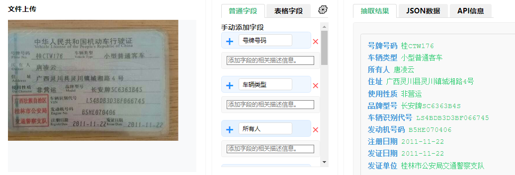 - 关键字段提取:通过关键字匹配或语义分析,将识别出的文本自动归类到“车主”、“车牌号”、“注册日期”、“品牌型号”等预设字段中。