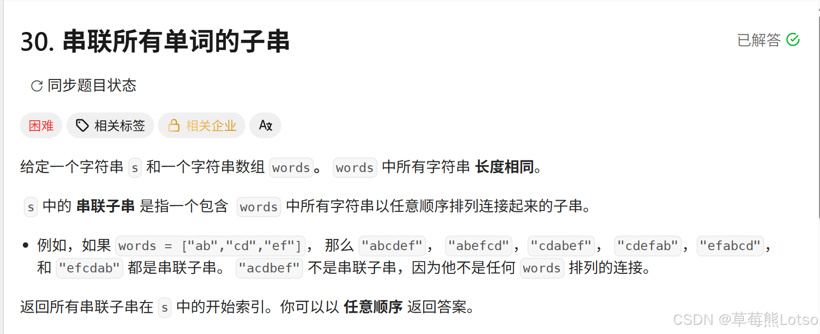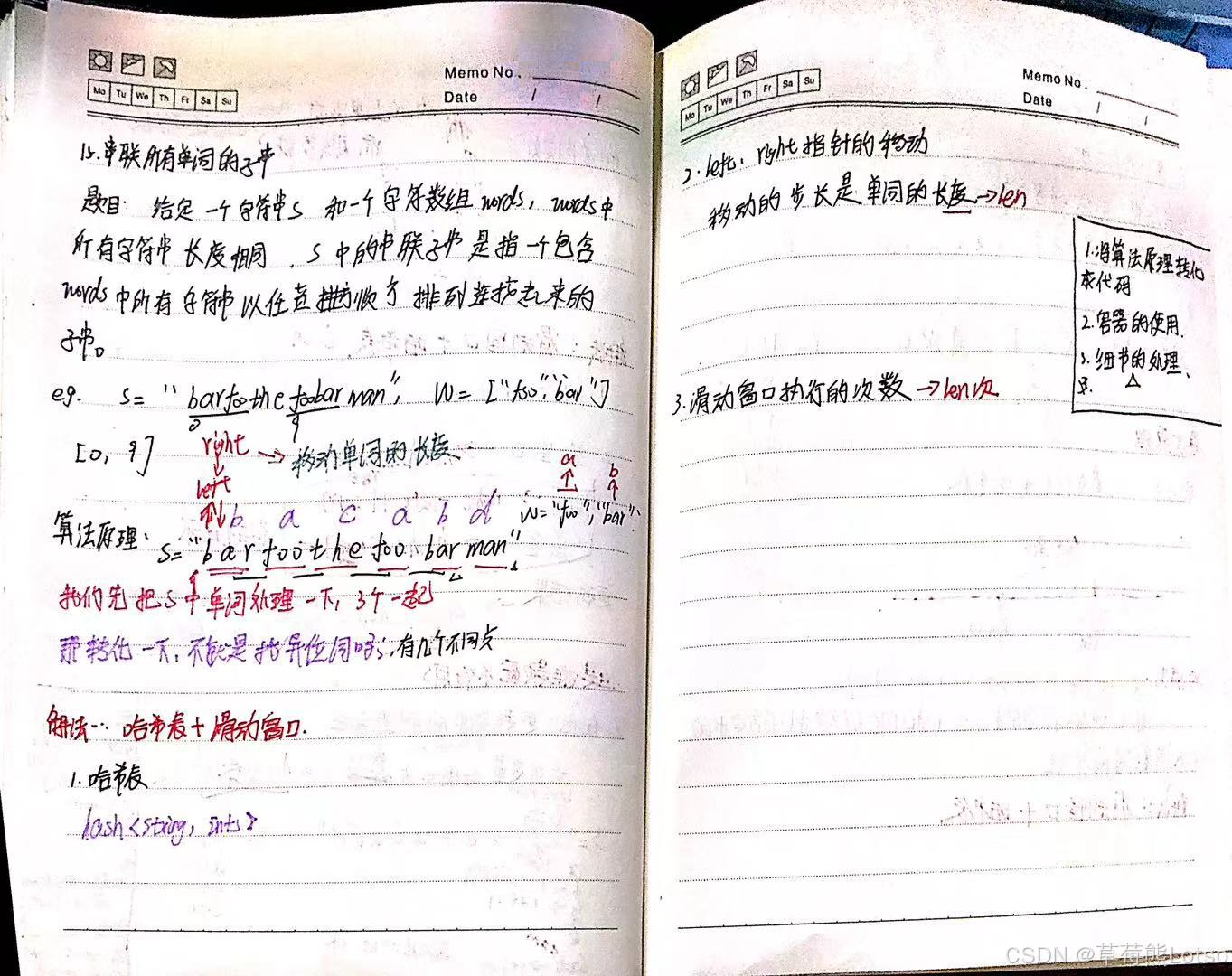 public:vector<int> findSubstring(string s, vector<string>& words) {vector<int> ret;unordered_map<string,int> hash1;//保存words里面所有单词的频次for(auto &s:words) hash1[s]++;int len=words[0].size(),m=words.size();for(int i=0;i<len;i++)//执行len次{unordered_map<string,int> hash2;//维护窗口内单词的频次for(int left=i,right=i,count=0;right+len<=s.size();right+=len){//进窗口+维护countstring in=s.substr(right,len);hash2[in]++;if(hash1.count(in)&&hash2[in]<=hash1[in]) count++;if(right-left+1>len*m)//判断{//出窗口+维护countstring out=s.substr(left,len);if(hash1.count(out)&&hash2[out]<=hash1[out]) count--;hash2[out]--;left+=len;}if(count==m) ret.push_back(left);//更新结果}}return ret;}