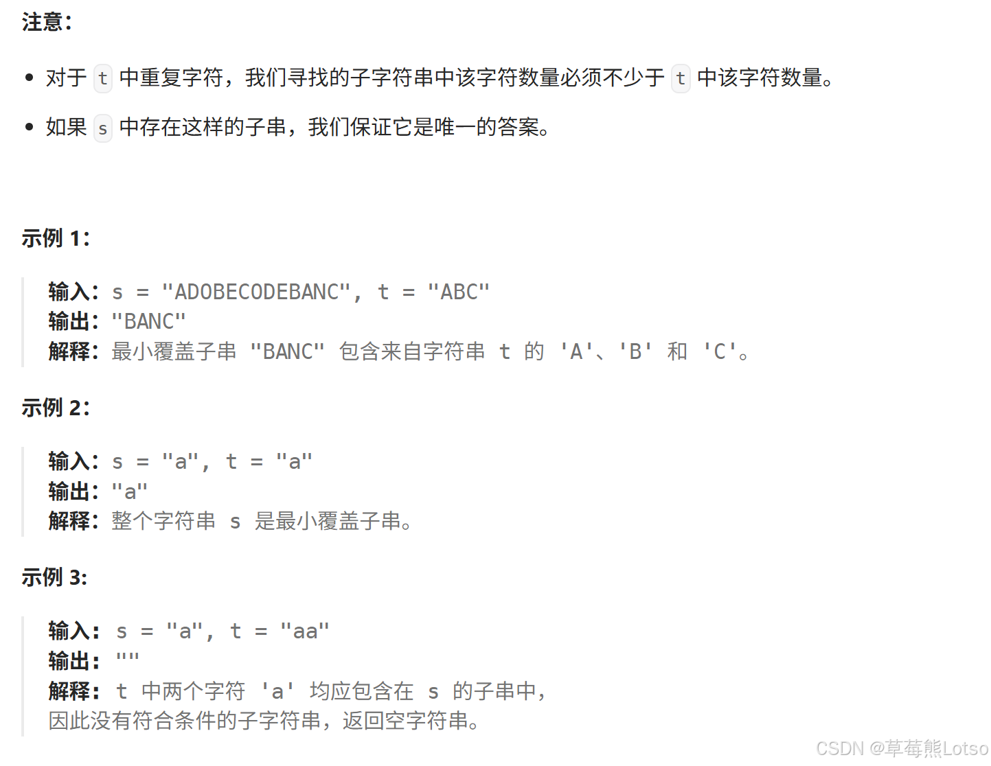 public:string minWindow(string s, string t) {int hash1[128] = {0}; // 统计字符串 t 中每⼀个字符的频次int kinds = 0; // 统计有效字符有多少种for (auto ch : t)if (hash1[ch]++ == 0)kinds++;int hash2[128] = {0}; // 统计窗⼝内每个字符的频次int minlen = INT_MAX, begin = -1;for (int left = 0, right = 0, count = 0; right < s.size(); right++) {char in = s[right];if (++hash2[in] == hash1[in]) count++; // 进窗⼝ + 维护 countwhile (count == kinds) // 判断条件{if (right - left + 1 < minlen) // 更新结果{minlen = right - left + 1;begin = left;}char out = s[left++];if (hash2[out]-- == hash1[out])count--; // 出窗⼝ + 维护 count}}return begin==-1?"":s.substr(begin, minlen);}