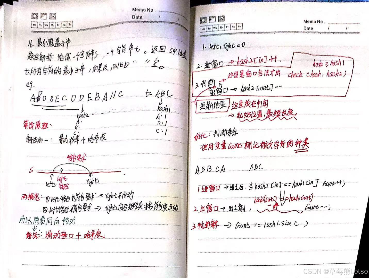 public:string minWindow(string s, string t) {unordered_map<char,int> hash1;for(auto &ch:t) hash1[ch]++;unordered_map<char,int> hash2;int n=hash1.size(),m=s.size(),len=INT_MAX,reti=0;for(int left=0,right=0,count=0;right<m;right++){//进窗口+维护countchar in=s[right];hash2[in]++;if(hash1.count(in)&&hash2[in]==hash1[in]) count++;while(count==n)//判断{//更新结果if(right-left+1<len){len=right-left+1;reti=left;}//出窗口+维护countchar out=s[left++];if(hash1.count(out)&&hash2[out]==hash1[out]) count--;hash2[out]--;}}return len==INT_MAX?"":s.substr(reti,len);}