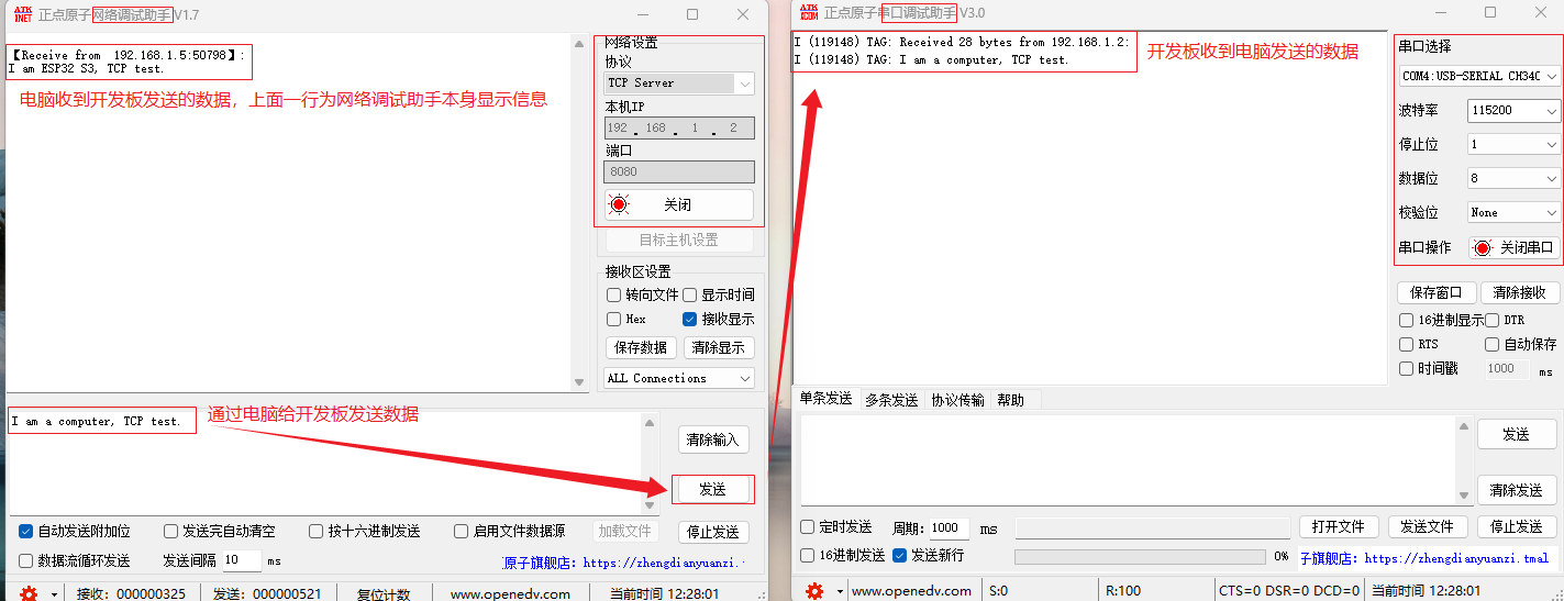 当网络调试助手接收到开发板发送的字符串时,它会在显示区域展示这个信息。此外,用户还可以在调试助手的发送区域输入要发送的数据,然后点击发送键(I am a computer, TCP test.),将数据发送至ESP32-S3 设备。此时, ESP32-S3 的串口将打印接收到的数据,具体操作和输出如下图所示。