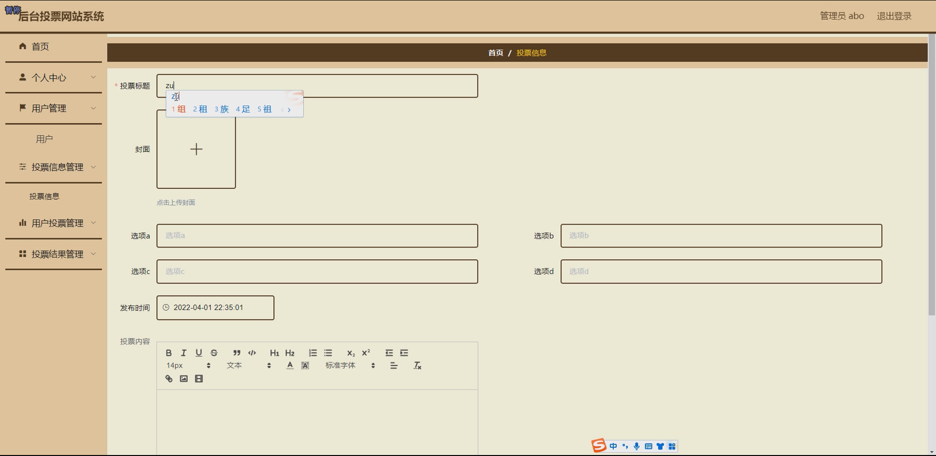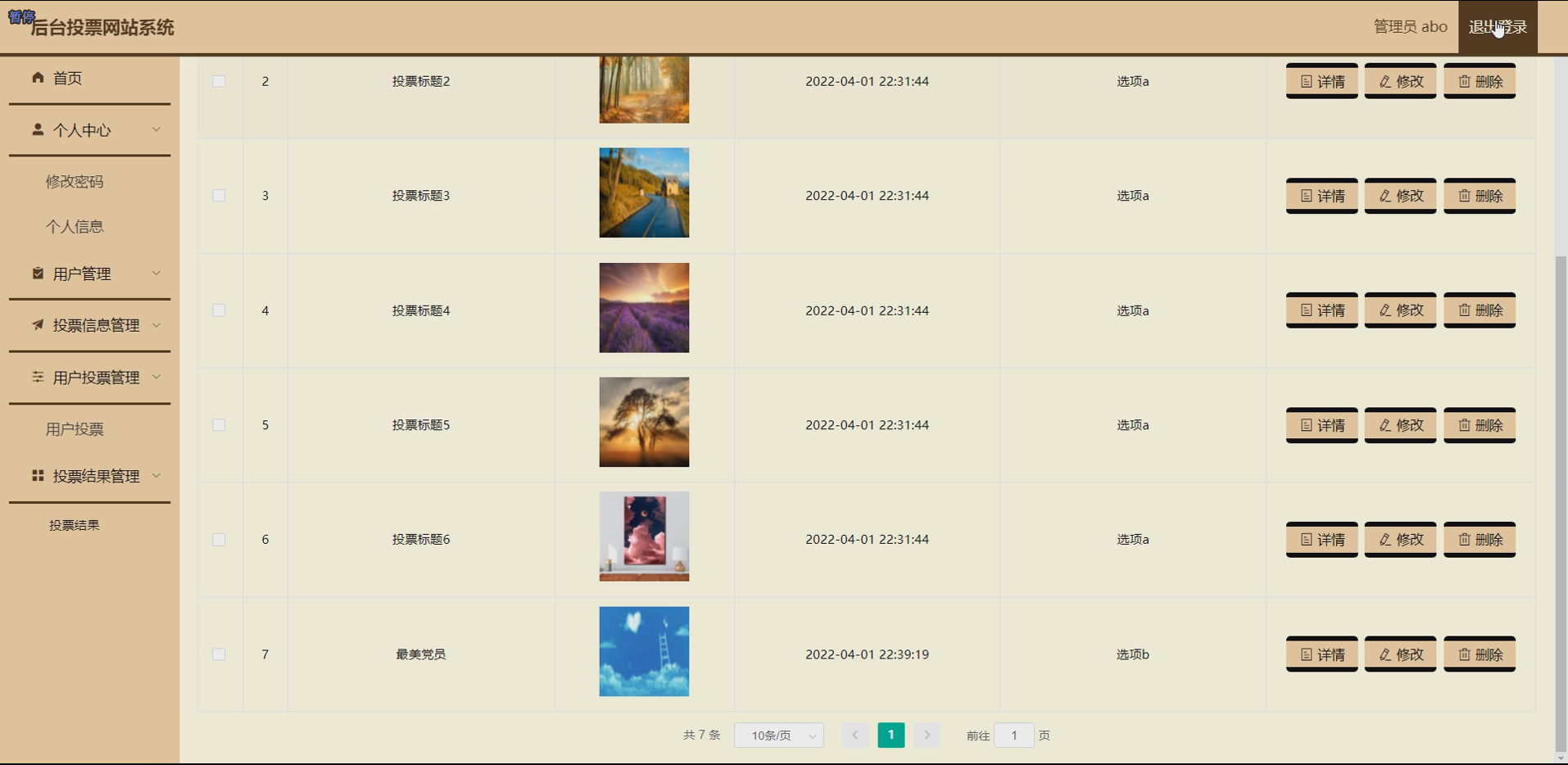 - 投票信息模块:实现投票信息的发布、查询、修改、删除等功能。管理员可以在后台发布新的投票信息,包括投票标题、投票描述、投票选项、投票开始时间、投票结束时间、投票是否公开等信息;普通用户可以在前台查询所有正在进行的投票信息,并根据自己的兴趣选择参与投票;管理员可以对已发布的投票信息进行修改和删除操作,但在投票开始后,若已有用户参与投票,则只能修改投票描述等非关键信息,不能修改投票选项和投票时间。