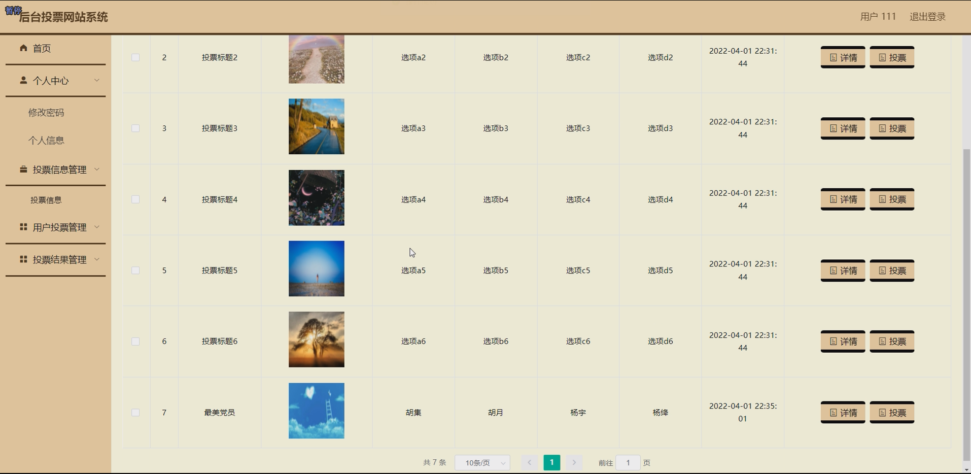 进行系统的前后端界面设计。前端界面包括用户注册登录界面、投票信息列表界面、投票详情与投票界面、投票结果展示界面、用户个人中心界面等;后台界面包括管理员登录界面、用户管理界面、投票信息管理界面、投票结果管理界面等。界面设计遵循日常简约的风格,注重色彩搭配的合理性和界面布局的简洁性,确保用户能够轻松操作和使用系统。