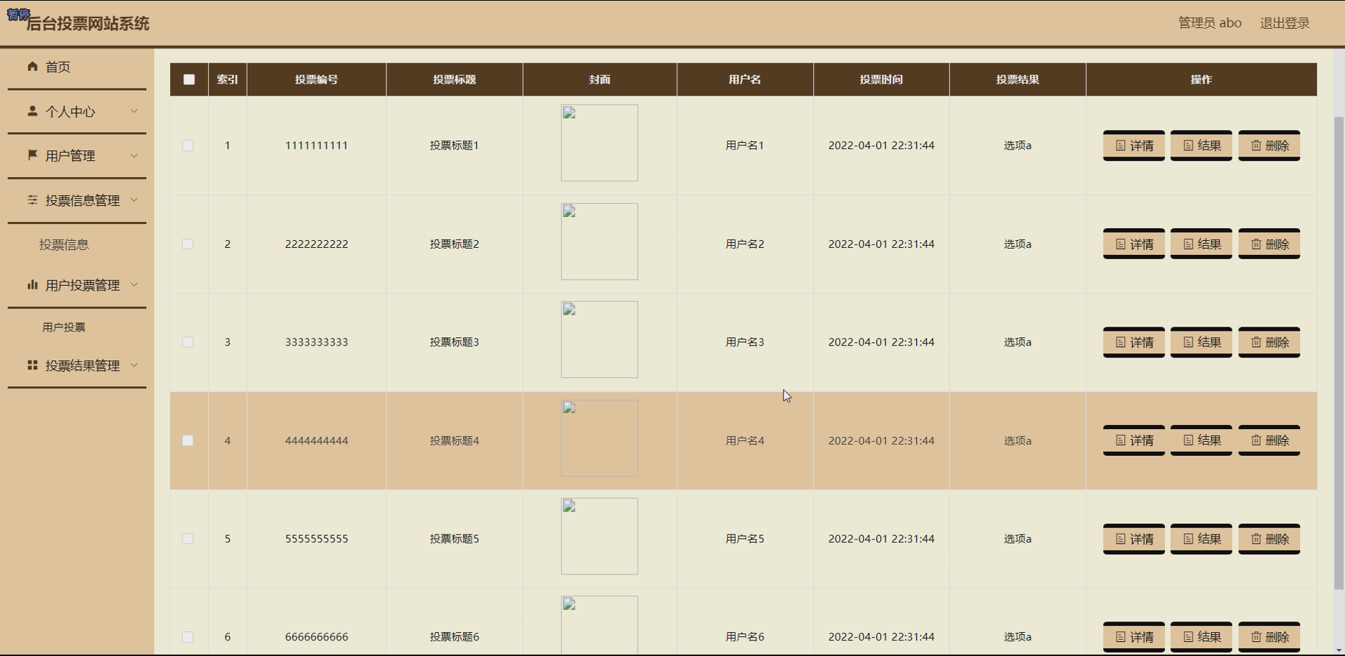 - 投票结果模块:实现投票结果的统计、查询和展示功能。系统根据用户的投票数据,实时统计每个投票选项的得票数和得票率;管理员可以在后台查询所有投票活动的详细投票结果,包括每个用户的投票记录;普通用户可以在前台查询已公开的投票活动的投票结果,系统以图表(如柱状图、饼图)和文字的形式展示投票结果,使用户能够直观地了解投票情况。