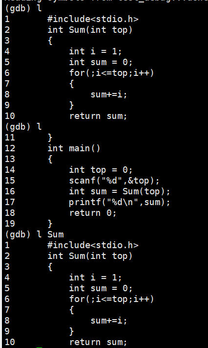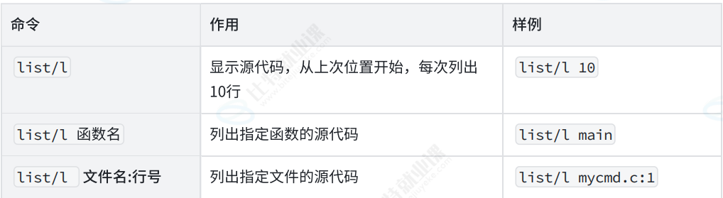list/l 行号 //显示binFile源代码,接着上次的位置往下列,每次列10行。