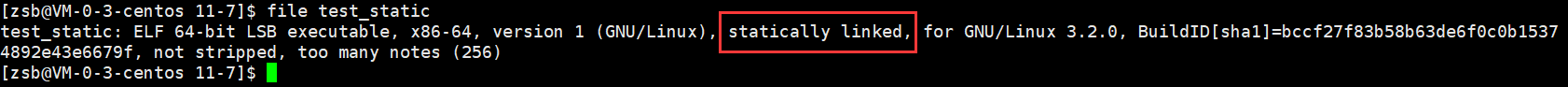 用 file 命令查看 test_static 文件的类型。输出中的 statically linked 明确表明该程序是静态链接的,同时还显示了程序的架构(x86-64)、格式(ELF 64位)等信息,验证了前面静态编译的结果。