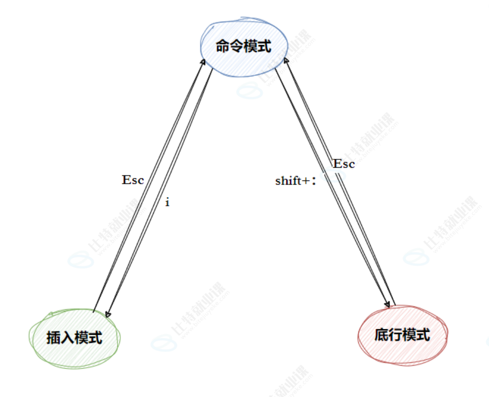 任何模式回到命令模式,都可以按Esc,插入模式进入底行模式,首先需要回到命令模式(Esc),然后 shift+:就可以了;底行模式进入命令模式:按Esc就直接回到命令模式;底行模式进入插入模式:按Esc进入命令模式,然后 i 进入插入模式