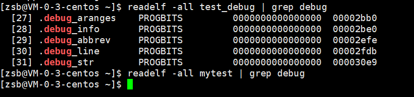 readelf指令用来显示一个或者多个elf格式的目标文件的信息,这里我们用readelf来显示一下debug版本的可执行程序和release版本的可执行程序,我们发现debug版本中有调试信息,而release版本中没有调试信息