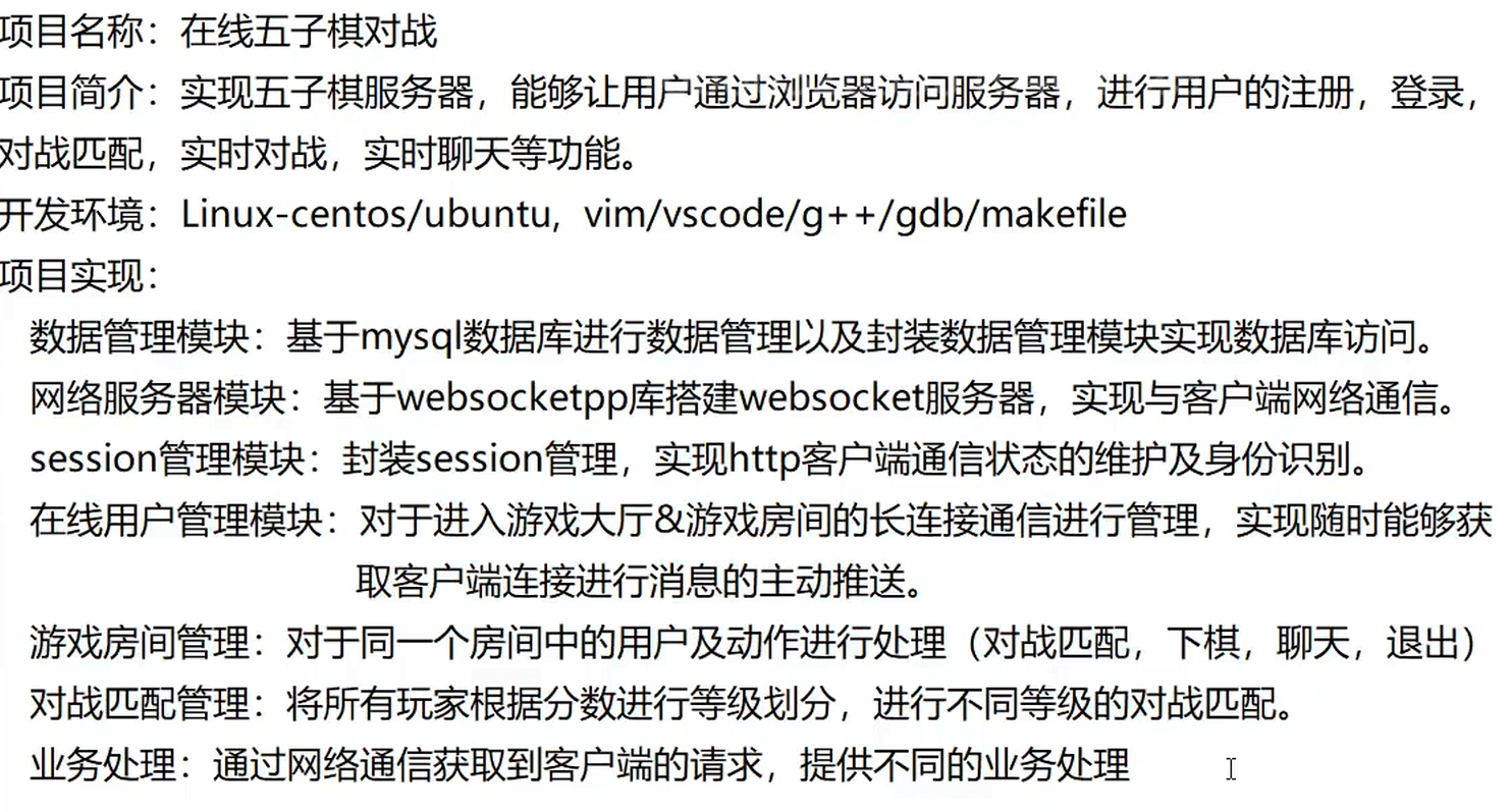 {private:std::string _web_root;//静态资源更目录 ./wwwroot/ /register.html -> ./wwwroot/register.htmlwsserver_t _wssrv;user_table _ut;online_manager _om;room_manager _rm;session_manager _sm;matcher _mm;private:void file_handler(wsserver_t::connection_ptr& conn){//静态资源请求的处理//1.获取到请求uri-资源路径,了解客户端请求的页面文件名称websocketpp::http::parser::request req = conn->get_request();std::string uri = req.get_uri();//2.组合出文件的实际路径,相对跟目录 + uristd::string realpath = _web_root + uri;//3.如果是目录,增加后缀 login.html / --> /login.htmlif(realpath.back() == '/'){realpath += "login.html";}//4.读取文件内容Json::Value resp_json;std::string body;bool ret = file_util::read(realpath,body);//1.文件不存在,返回404if(ret == false){body += "<html>";body += "<head>";body += "<meta charset=\"UTF-8\">";body += "</head>";body += "<body>";body += "<h1> NOT Found </h1>";body += "</body>";body += "</html>";conn->set_status(websocketpp::http::status_code::not_found);conn->set_body(body);return;}//5.设置响应正文conn->set_status(websocketpp::http::status_code::ok);conn->set_body(body);}void http_resp(wsserver_t::connection_ptr &conn,bool result,websocketpp::http::status_code::value code,const std::string& reason){Json::Value resp_json;resp_json["result"] = result;resp_json["reason"] = reason;std::string resp_body;json_util::serialize(resp_json,resp_body);conn->set_status(code);conn->set_body(resp_body);conn->append_header("Content-Type","application/json");}void reg(wsserver_t::connection_ptr& conn){//用户注册功能请求处理//1.获取到请求正文std::string req_body = conn->get_request_body();//2.对正文进行json反序列化,得到用户名和密码Json::Value login_info;bool ret = json_util::unserialize(req_body,login_info);if(ret == false){DLOG("反序列化注册信息失败");return http_resp(conn,false,websocketpp::http::status_code::bad_request,"请求的正文格式错误");}//3.进行数据库的用户新增操作if(login_info["username"].isNull() || login_info["username"].isNull()){DLOG("用户名密码不完整");return http_resp(conn,false,websocketpp::http::status_code::bad_request,"请输入用户名和密码");}ret = _ut.insert(login_info);if(ret == false){DLOG("向数据库插入数据失败");return http_resp(conn,false,websocketpp::http::status_code::bad_request,"用户名以及被占用");}DLOG("注册成功");return http_resp(conn,true,websocketpp::http::status_code::ok,"注册用户成功");//成功 200//失败 400}void login(wsserver_t::connection_ptr& conn){//用户登录功能请求处理//1.获取请求正文,并进行json反序列化,得到用户名和密码std::string req_body = conn->get_request_body();Json::Value login_info;bool ret = json_util::unserialize(req_body,login_info);if(ret == false){DLOG("反序列化注册信息失败");return http_resp(conn,false,websocketpp::http::status_code::bad_request,"请求的正文格式错误");}//2.校验正文完整性,进行数据库的用户信息验证if(login_info["username"].isNull() || login_info["username"].isNull()){DLOG("用户名密码不完整");return http_resp(conn,false,websocketpp::http::status_code::bad_request,"请输入用户名和密码");}ret = _ut.login(login_info);if(ret == false){// 1.如果验证失败,则返回400DLOG("用户名密码错误");return http_resp(conn,false,websocketpp::http::status_code::bad_request,"用户名密码错误");}//3.如果验证成功,给客户端创建session,则返回200uint64_t uid = login_info["id"].asUInt64();session_ptr ssp = _sm.create_session(uid,LOGIN);if(ssp.get() == nullptr){DLOG("创建会话失败");return http_resp(conn,false,websocketpp::http::status_code::internal_server_error,"创建会话失败");}_sm.set_session_expire_time(ssp->ssid(),SESSION_TIMEOUT);//4.设置响应头部: Set-Cookie,将sessionid通过cookie返回std::string cookie_ssid = "SSID=" + std::to_string(ssp->ssid());conn->append_header("Set-Cookie",cookie_ssid);return http_resp(conn,true,websocketpp::http::status_code::ok,"登录成功");}bool get_cookie_val(std::string& cookie_str,const std::string& key,std::string&val){//Cookie: SSID=XXX; path=/;//1.以; 作为间隔,作为字符串进行分割,得到各个单个的cookie信息std::string sep = "; ";std::vector<std::string> cookie_arr;string_util::split(cookie_str,sep,cookie_arr);//2.对单个cookie字符串,以 = 为间隔进行分割,得到key和valfor(auto str:cookie_arr){std::vector<std::string> tmp_arr;string_util::split(str,"=",tmp_arr);if(tmp_arr.size() != 2){continue;}if(tmp_arr[0] == key){val = tmp_arr[1];return true;}}return false;}void info(wsserver_t::connection_ptr& conn){//用户信息功能请求处理Json::Value err_resp;//1.获取请求信息中的Cookie,从Cookie中获取ssidstd::string cookie_str = conn->get_request_header("Cookie");if(cookie_str.empty()){//如果没有cookie,返回错误信息;没有cookie信息,让客户端重新登录return http_resp(conn,false,websocketpp::http::status_code::bad_request,"找不到cookie信息,请重新登录");}std::string ssid_str;bool ret = get_cookie_val(cookie_str,"SSID",ssid_str);if(ret == false){//cookie中没有ssid,返回错误信息;没有ssid信息,让客户端重新登录return http_resp(conn,false,websocketpp::http::status_code::bad_request,"找不到ssid信息,请重新登录");}//2.在session中查找到对应的会话信息session_ptr ssp = _sm.get_session_by_ssid(std::stol(ssid_str));if(ssp.get() == nullptr){//没有找到session,登录以及过期return http_resp(conn,false,websocketpp::http::status_code::bad_request,"登录过期,请重新登录");}//3.从数据库中取出用户信息,进行序列化发送给客户端uint64_t uid = ssp->get_user();Json::Value user_info;ret = _ut.select_by_id(uid,user_info);if(ret == false){//获取用户信息失败,返回错误: 找不到用户信息return http_resp(conn,false,websocketpp::http::status_code::bad_request,"找不到用