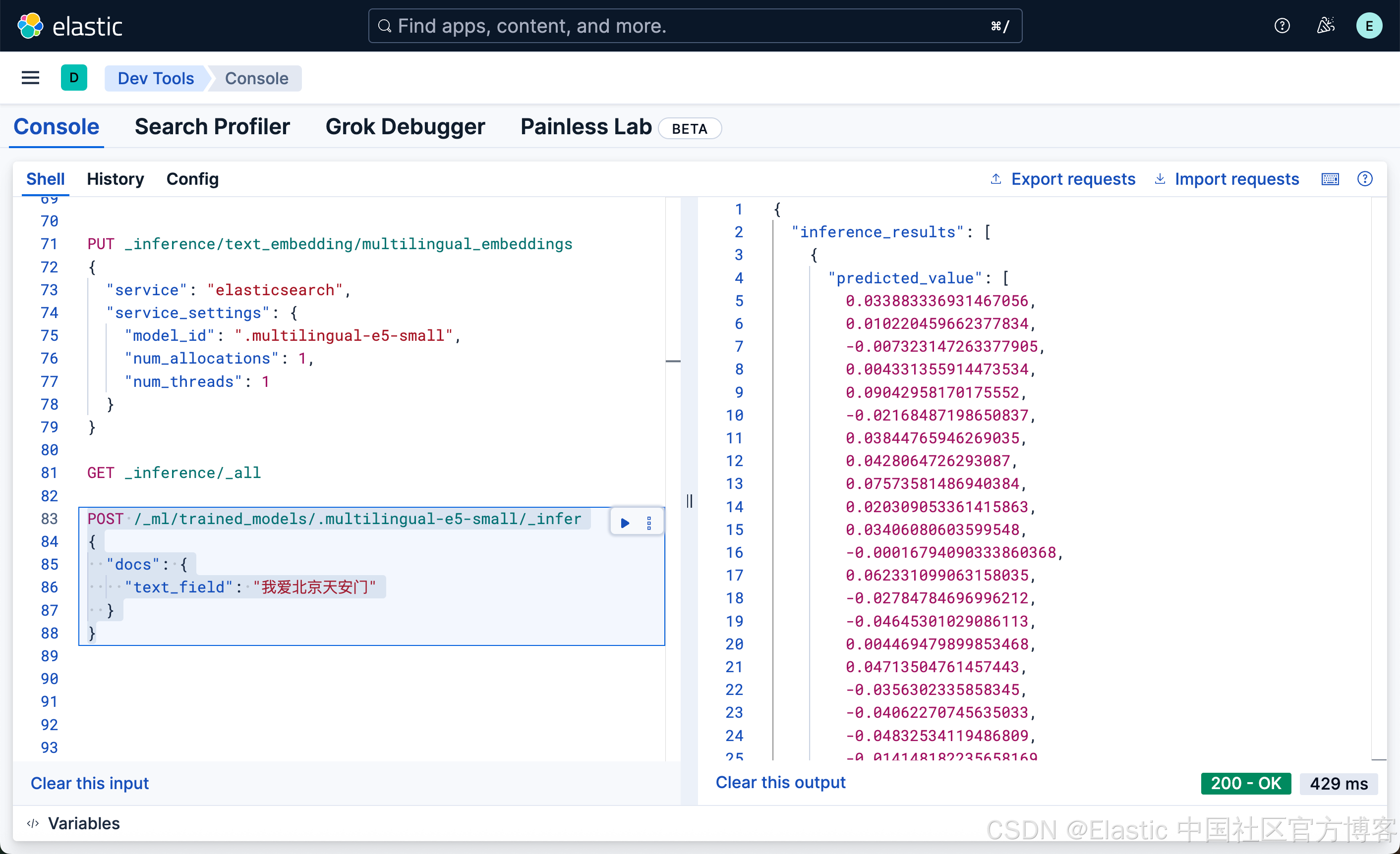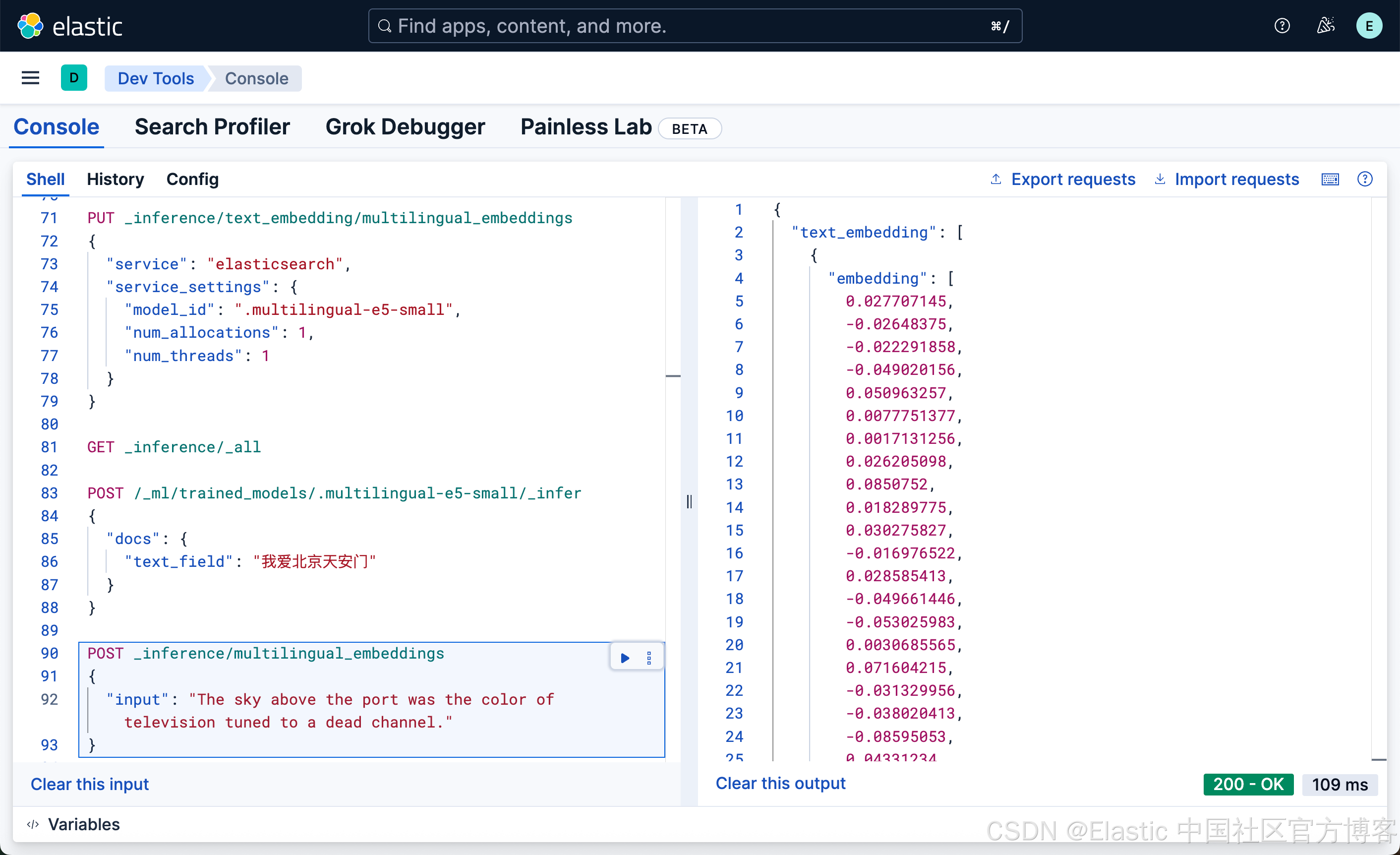 在上面,我们创建了一个叫做 multilingual_embeddings 的 endpoint。如果不是特别要求,我们可以使用系统为我们提供的 .multilingual-e5-small-elasticsearch 端点。